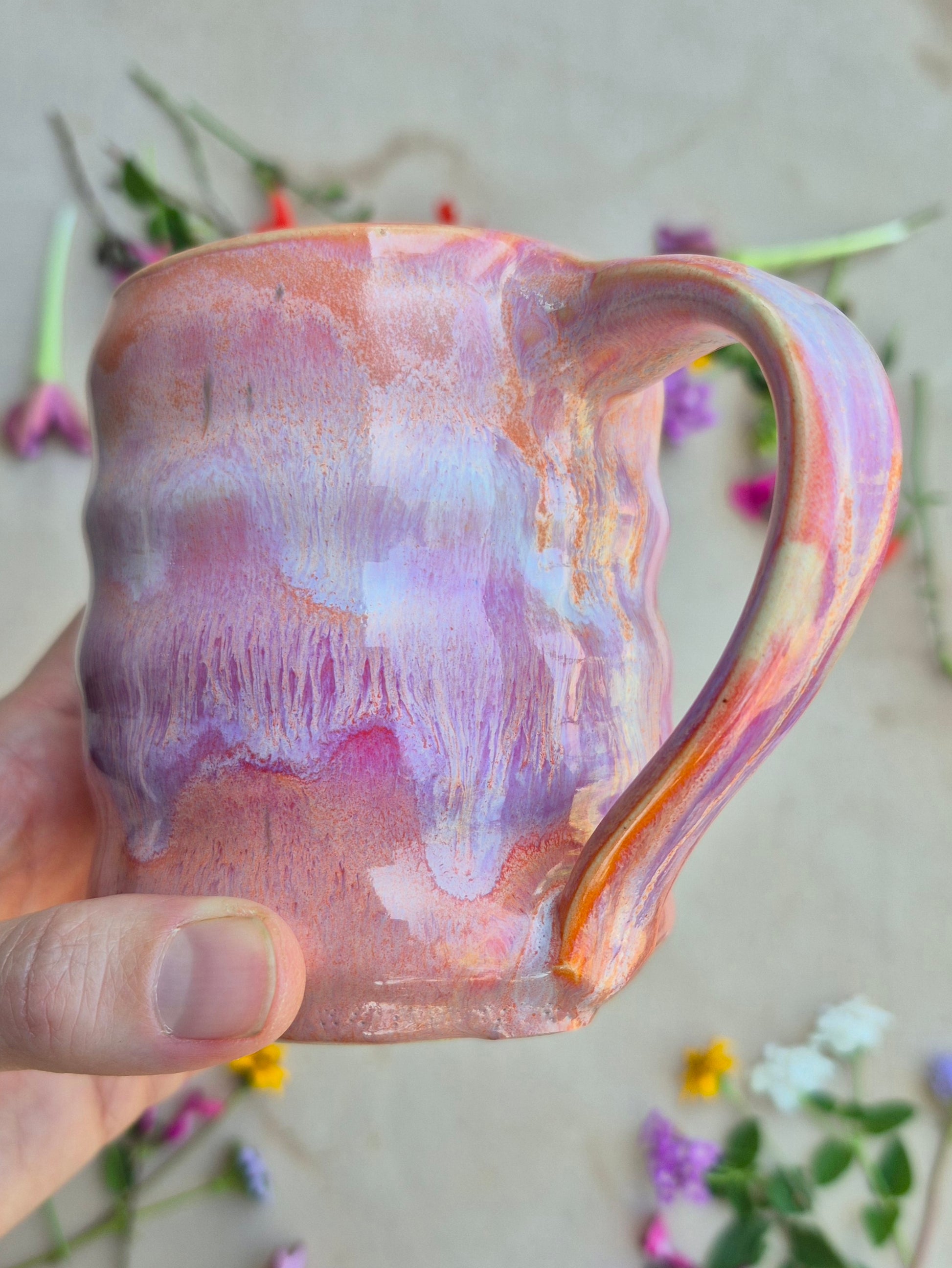 Wheel thrown mug in buff clay featuring a gorgeous glaze combo of soft and bright pinks. Check out the close ups of this gorgeous glaze combo! Perfect for your next cuppa, this mug will surely bring a smile to your face!