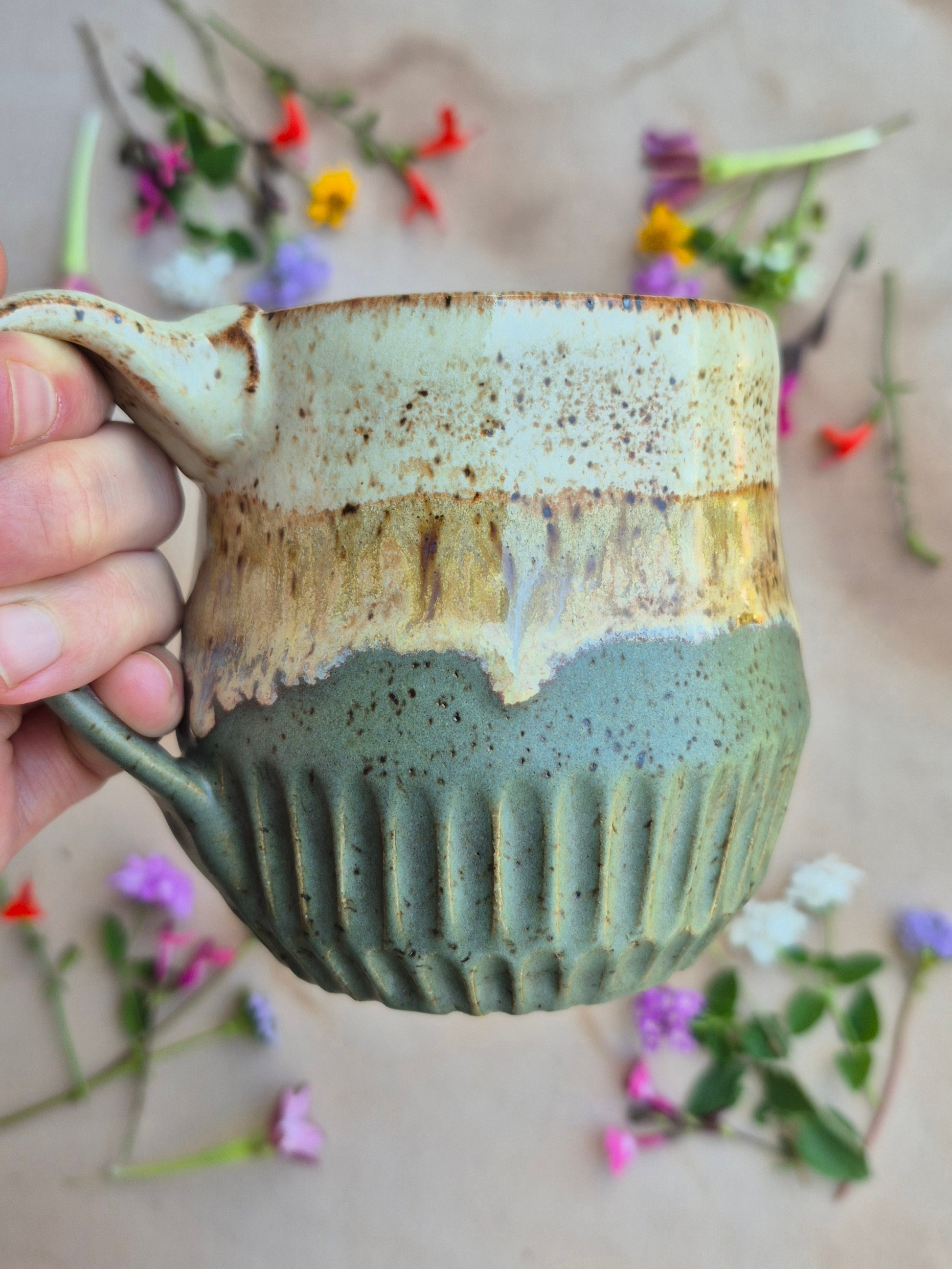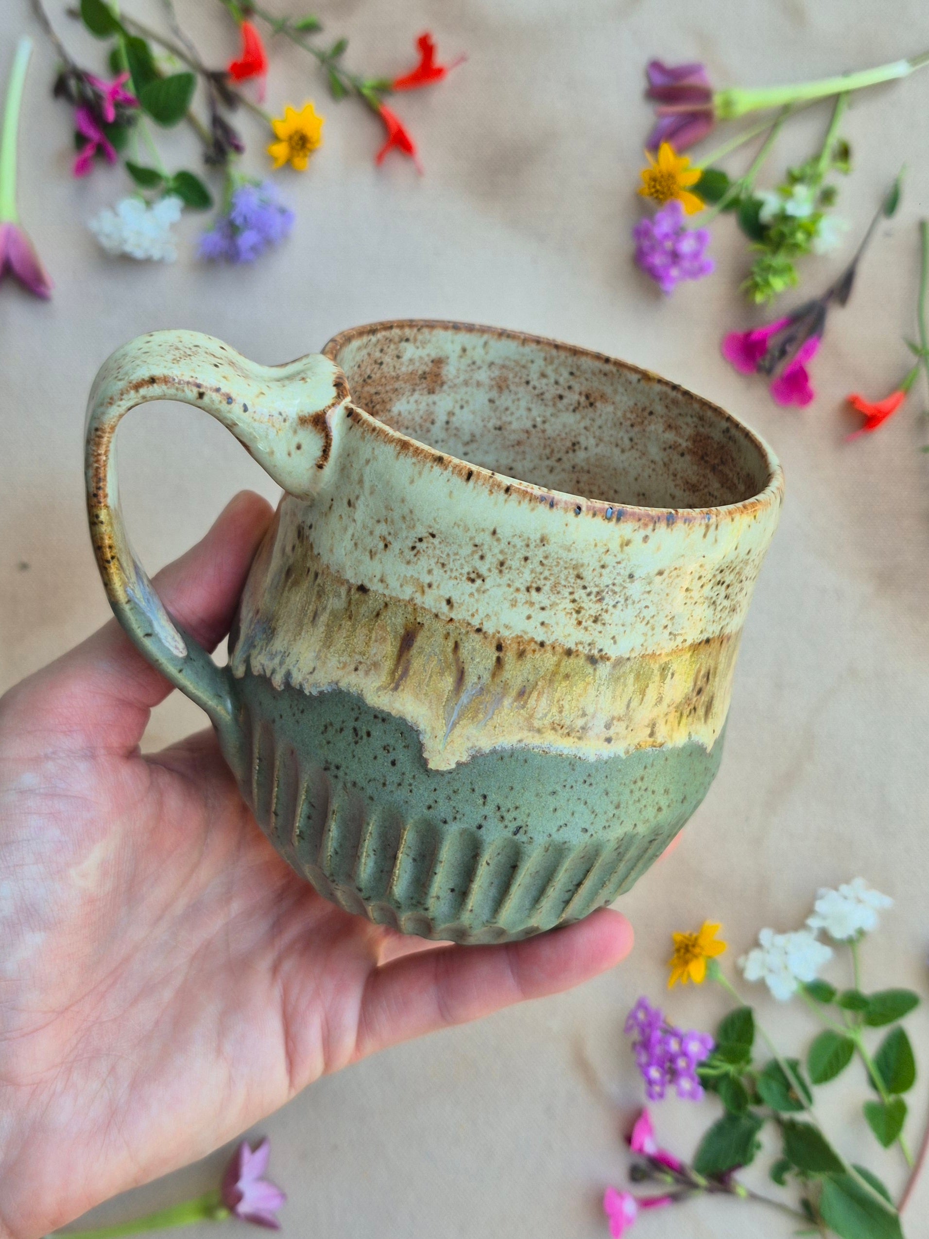 Wheel thrown mug in buff speckled clay featuring a matte mossy green, carved bottom and a light, creamy shino glaze on top. The matte glaze is so satisfying to the touch!