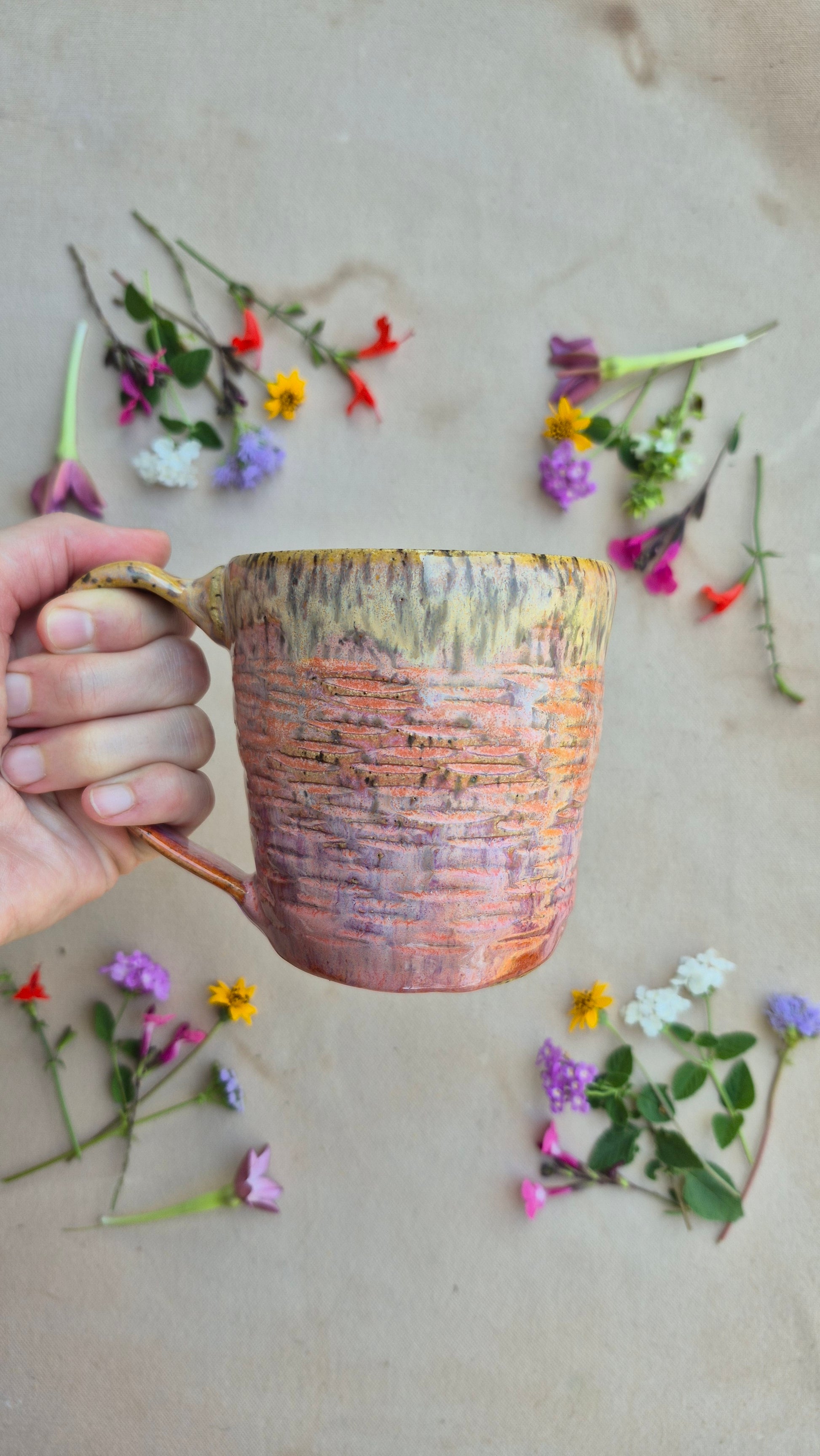 Wheel thrown mug in speckled buff clay featuring a gorgeous glaze combo of soft peaches and pinks and featuring a carved clay body. This cutie is ready to be your new favorite mug.