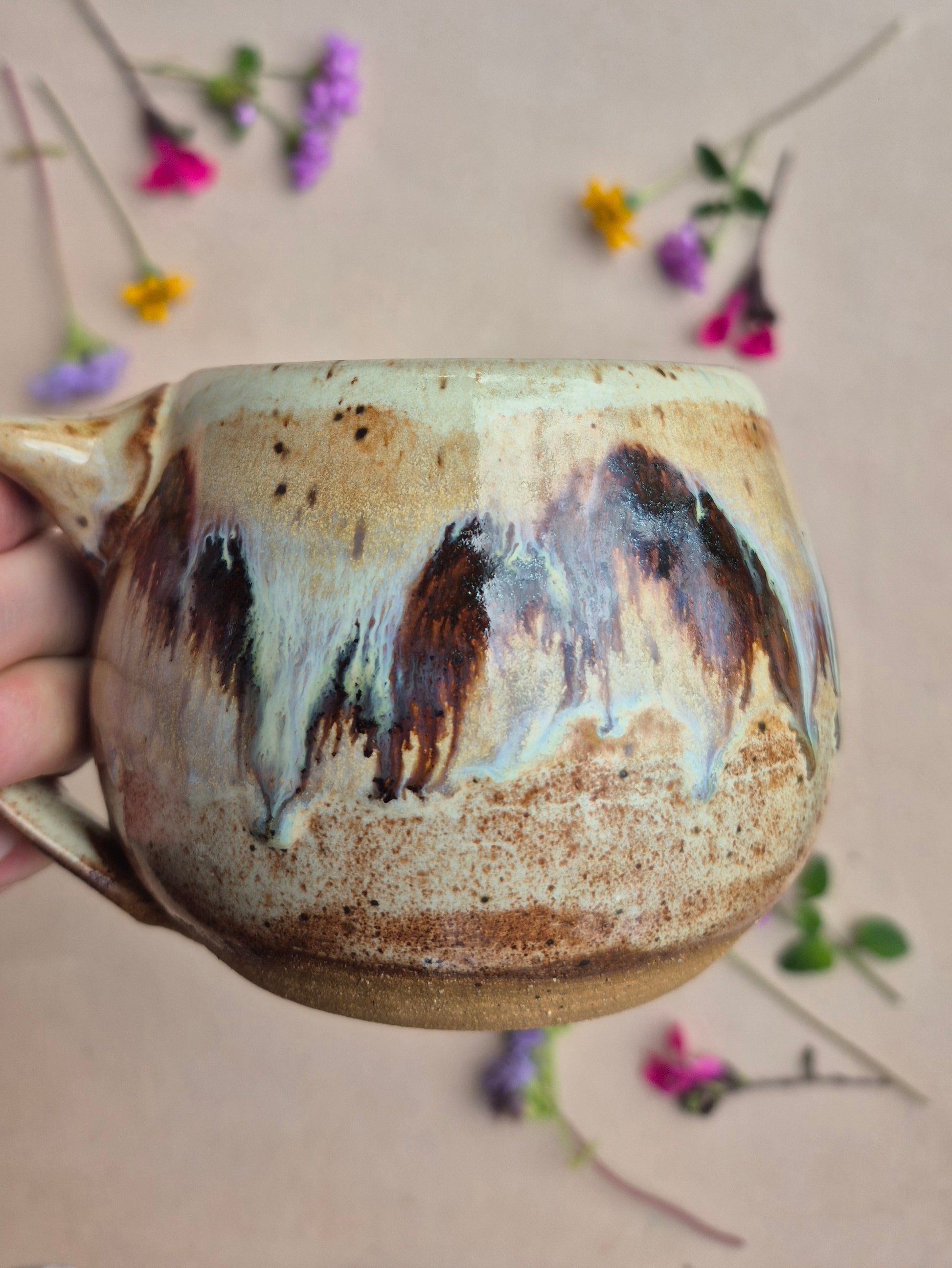 Wheel thrown mug in light red clay featuring a creamy, light shino glaze with accents of sparkling tea dust. This is such a cozy mug! Perfect for a yummy beverage on a cloudy, chilly day - maybe paired with a new book next to a cozy fireplace.