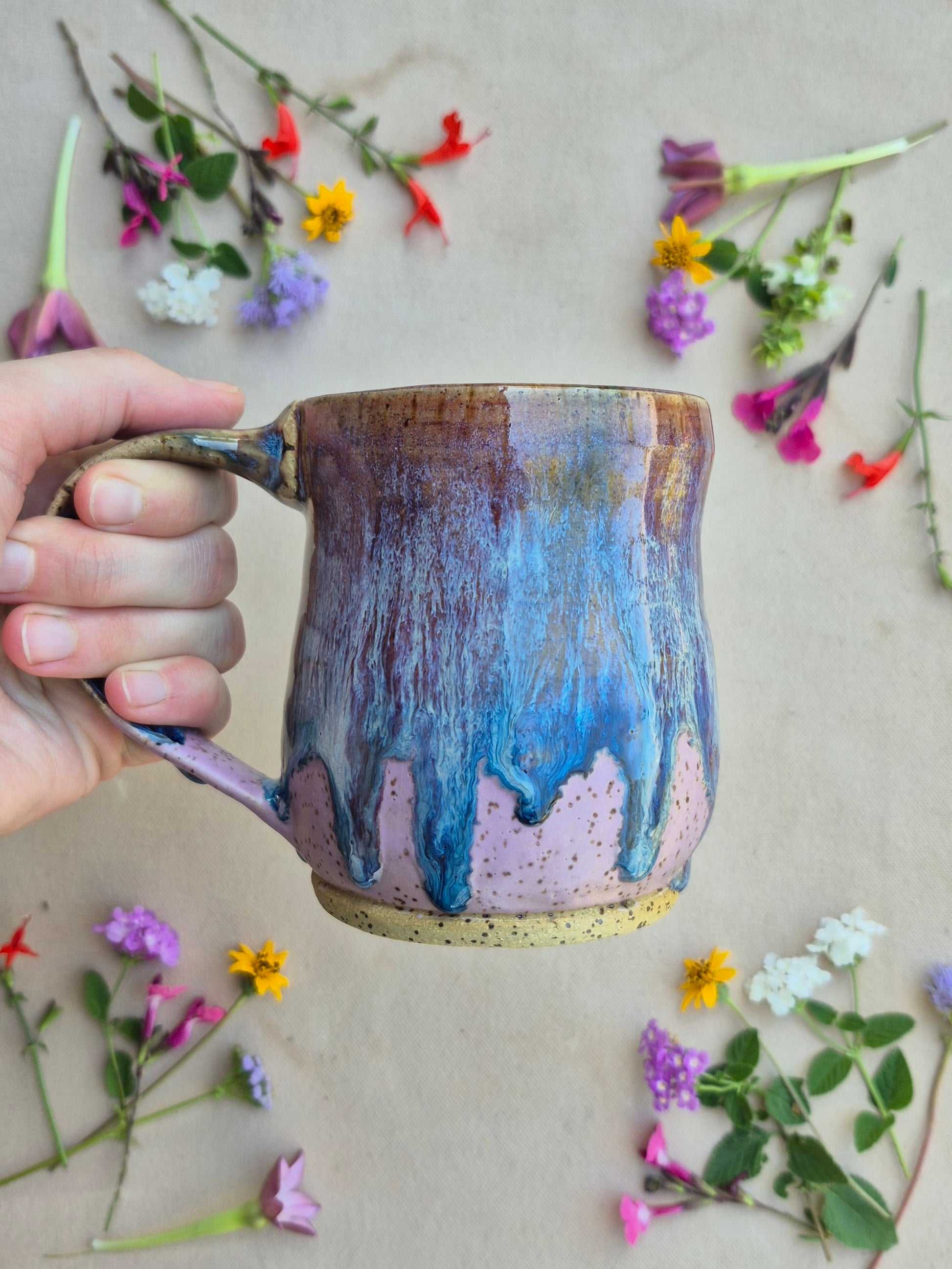 Wheel thrown mug in speckled buff clay featuring a vibrant, blue drippy glaze with a matte lavender glaze. A lovely mug for your next cuppa.