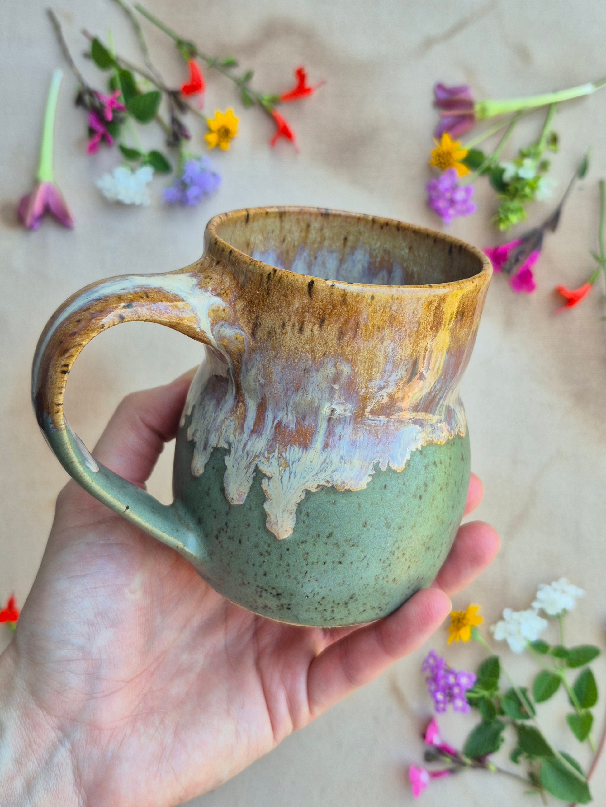 Wheel thrown mug in buff speckled clay featuring a matte mossy green and a light, creamy glaze on top. Perfect for your favorite hot cuppa.