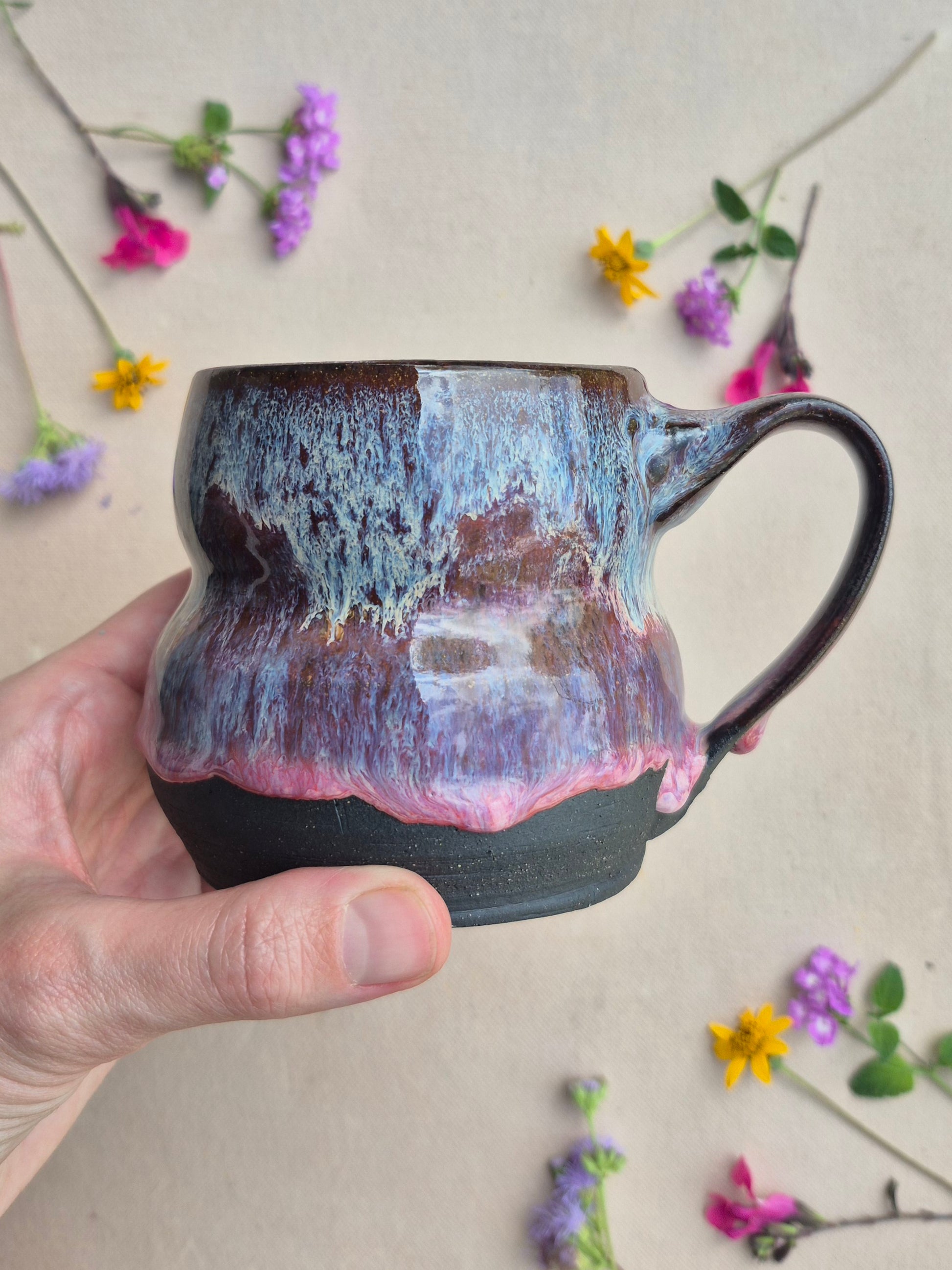 Wheel thrown mug in black clay featuring a gorgeous, drippy glaze combo of burgundy and purple. The glaze drips on this beat are perfect. This mug is sure to make you happy while sipping your favorite hot bevvy.
